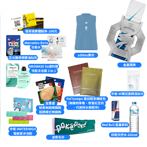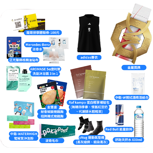 adidas 健身背心 (賽衣) / Red Bull 能量飲料 / Raf kampo 台灣漢方蛋白飲品牌 蛋白輕享補給包 / 金豐盛雞胸肉 招牌韓式嫩雞胸、秘香椒麻嫩雞胸 / 正光金絲膏 醫條根精油貼布 / sNug 運動氣墊襪 / 賓士香水 淡香水針管 / 龍哥按摩 體驗券100元 / 中衛 WATERHIGH電解質沖泡粉、W博拭酒精濕紙巾 / AROMASE 5α捷利爾洗髮沐浴露 3 in 1 / 波奇波奇 POKE POKE毛巾 / 舒跑天然水 600ml